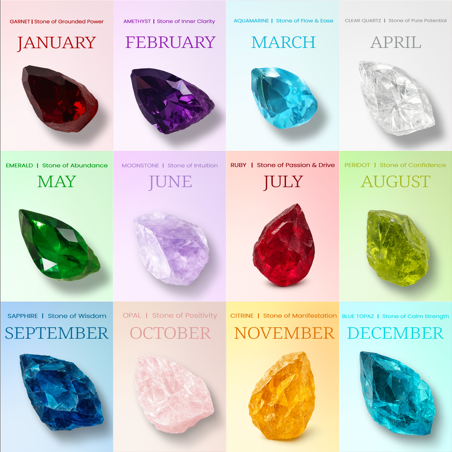 Born under a unique vibration. Every stone represents the energy you were born with — from confidence and passion to calm and clarity — a timeless reminder of your natural strengths.